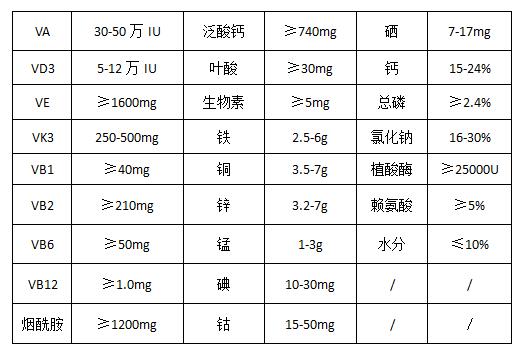 維生素A乙酸酯、維生素D3、dl-a-生育酚乙酸酯、維生素K3 、維生素B1 、維生素B2 、維生素B6 、維生素B12 、煙酰胺、D-泛酸鈣、葉酸、D-生物素、硫酸亞鐵、硫酸銅、硫酸鋅、硫酸錳、碘酸鈣、氯化鈷、亞硒酸鈉、賴氨酸、植酸酶、抗氧劑、磷酸氫鈣、氯化鈉、玉米粉、碳酸鈣等。